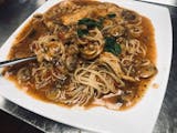 Sauteed with mushrooms, ham, and tomatoes in a rich cream sauce with a touch of marinara over fettuccine.