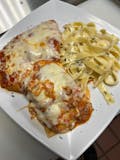 Breaded veal served with mozzarella, over spaghetti marinara.